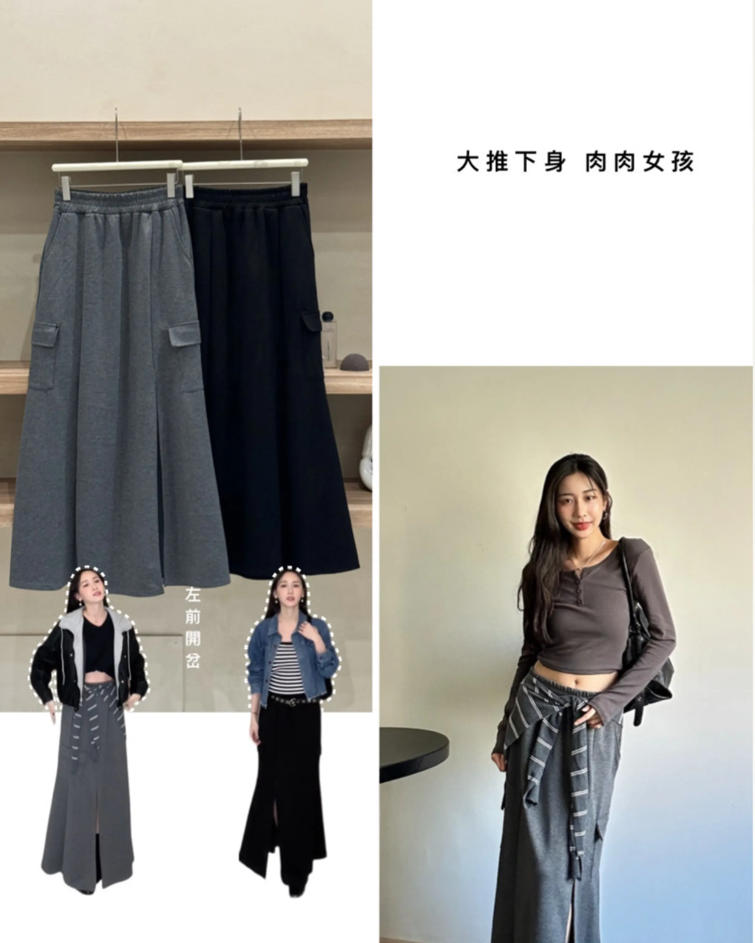 604(灰/黑)大推下身肉肉女孩~ 工裝感超舒服A字開岔裙