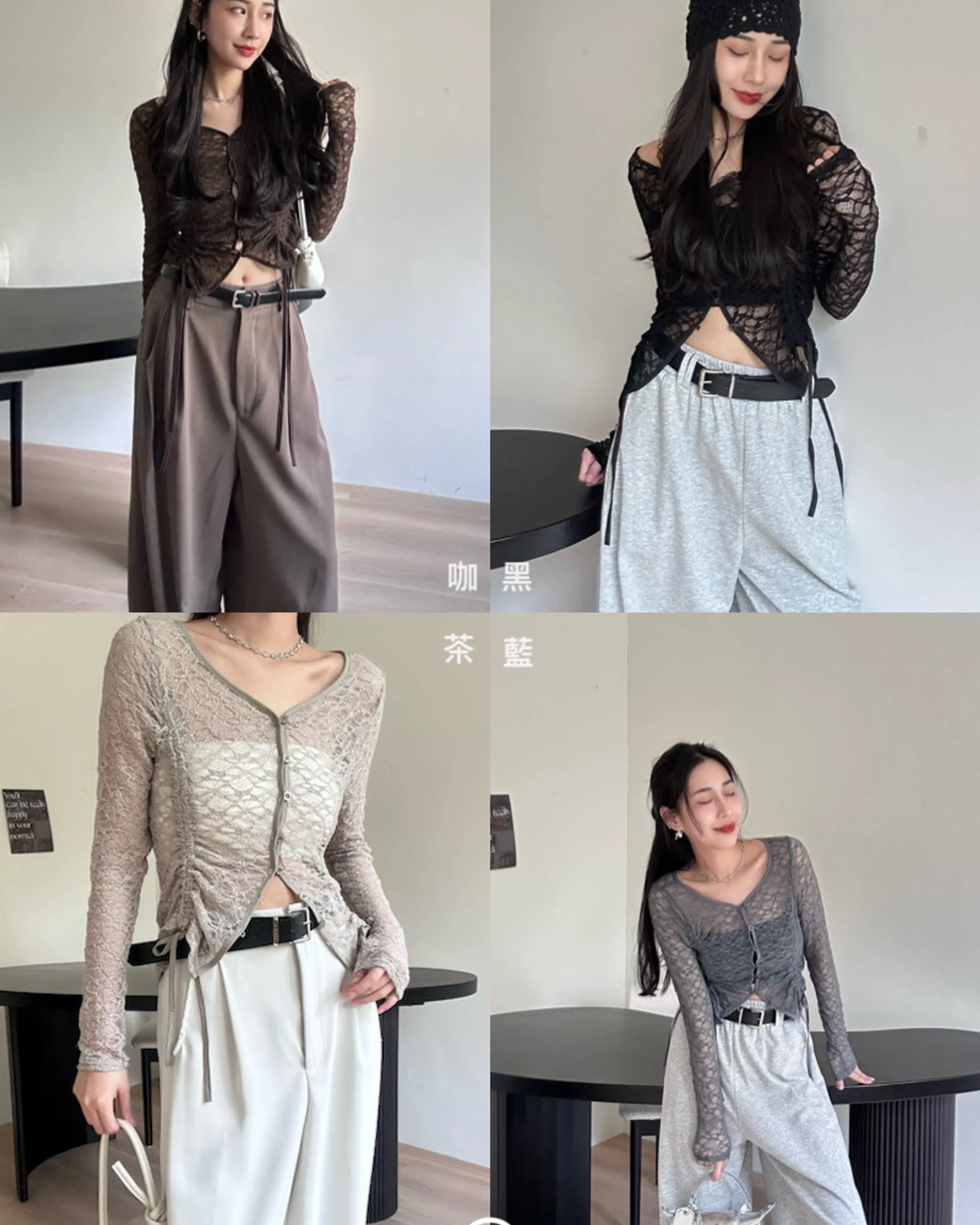 2915(茶/藍/黑/咖) 小辣透肌蕾絲上衣