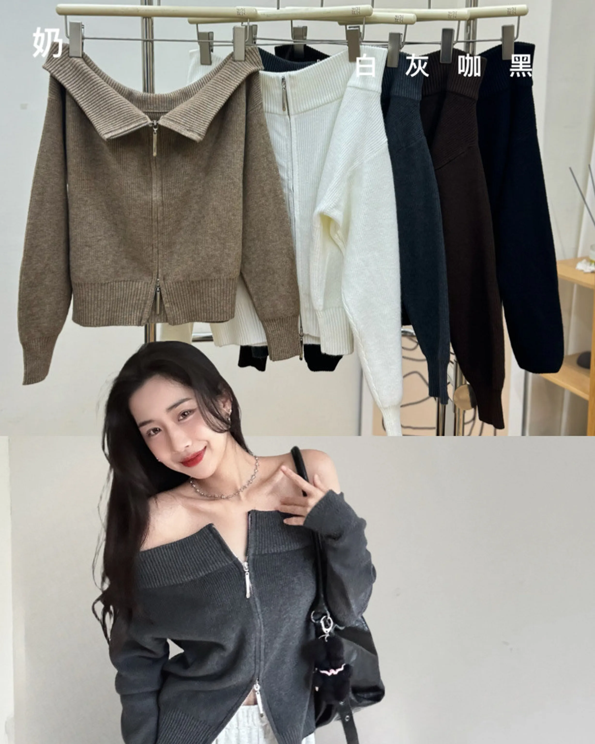 2909(咖/白/黑/灰/奶)造型拉鍊針織上衣