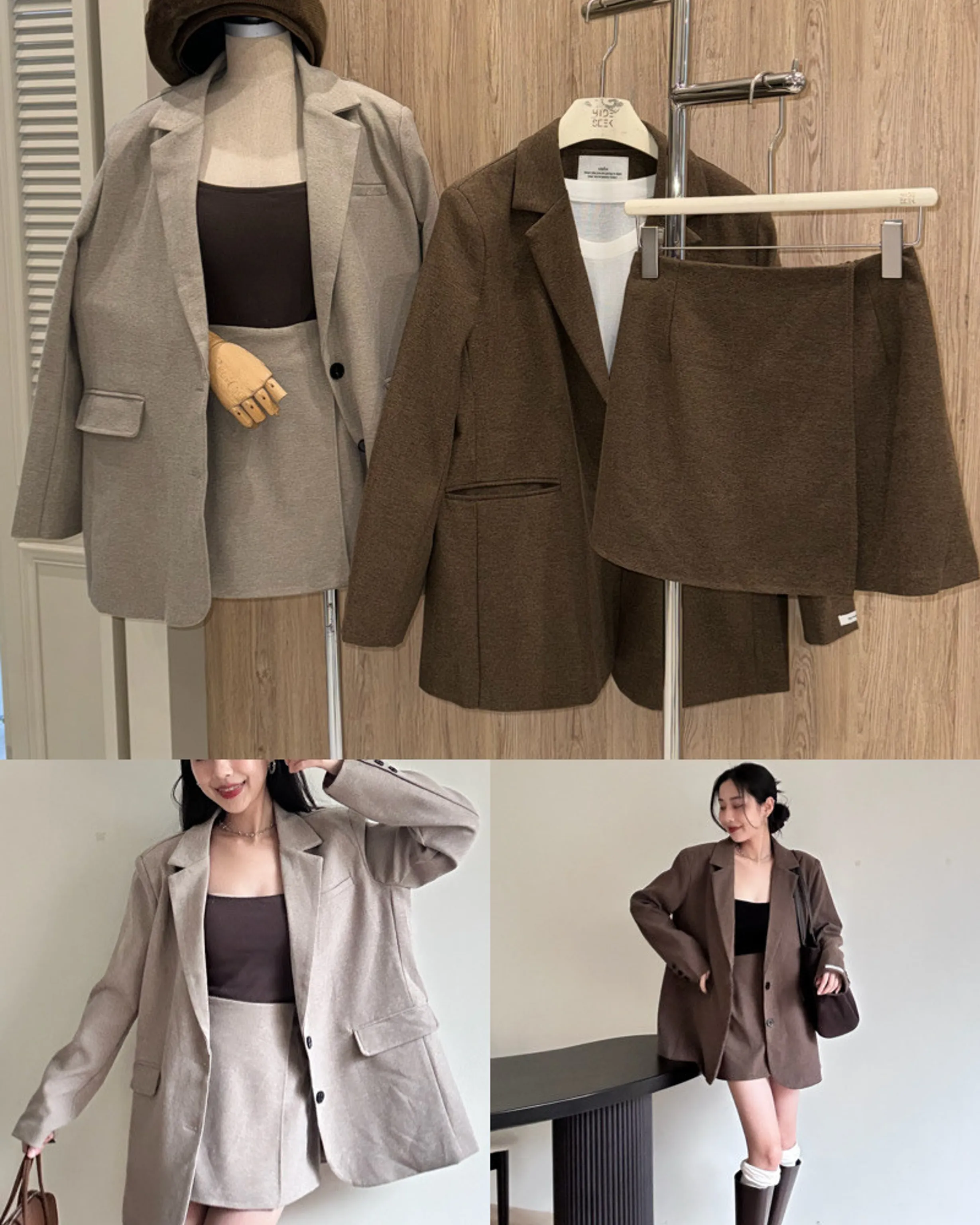 3017(奶/咖)毛尼西外套裝『西外+短裙』